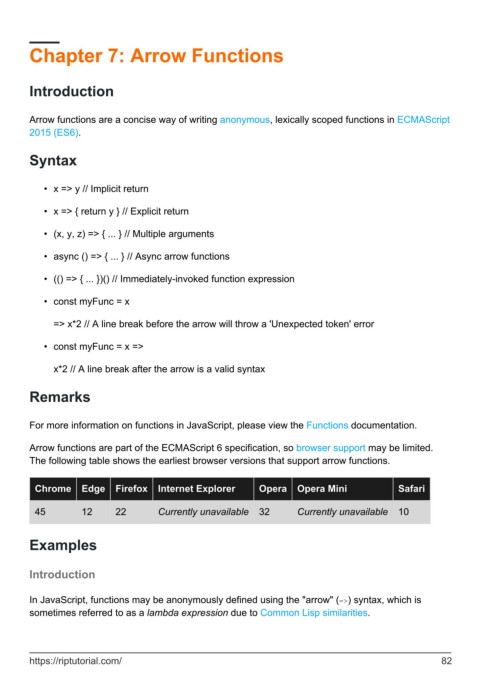 The following table shows the earliest browser versions that support arrow functions.