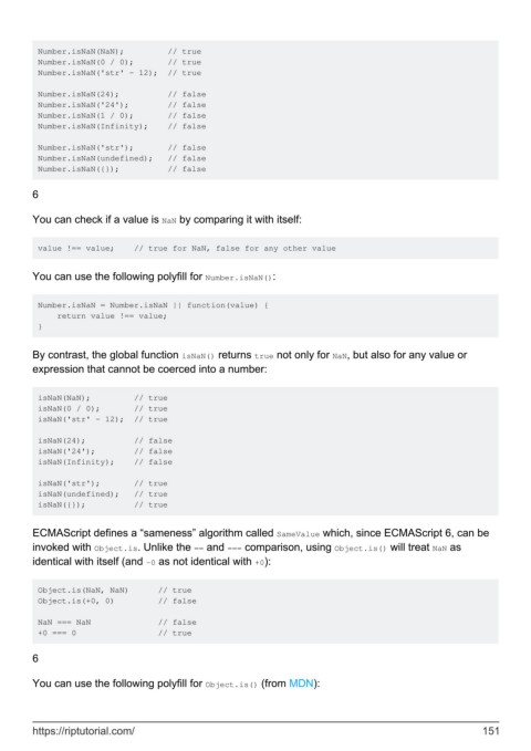By contrast, the global function isNaN() returns true not only for NaN, but also for any value or