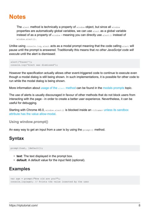 More information about usage of the alert method can be found in the modals prompts topic.